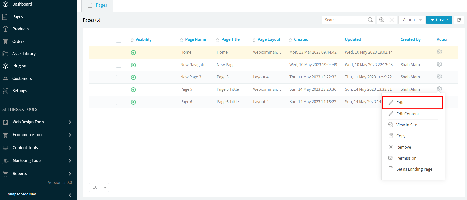 To create a new page in Web Commander, first, navigate to the dashboard and click on “Page” from the Side navigation menu.